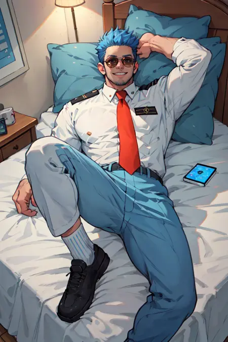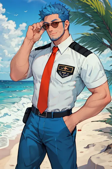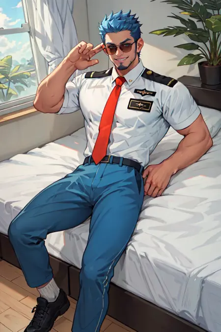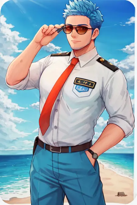 프롬프트: 파란 머리, 짧은 머리, 검은 눈, 파란 콧수염, 턱선 면도 자국, 항공기 조종사 유니폼, 흰색 셔츠, 빨간 넥타이, 어깨장식, 항공기 조종사 선글라스, 파란 바지, 양말, 검은 신발