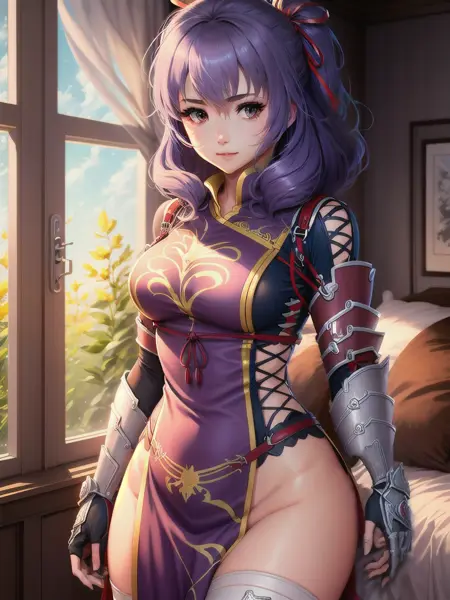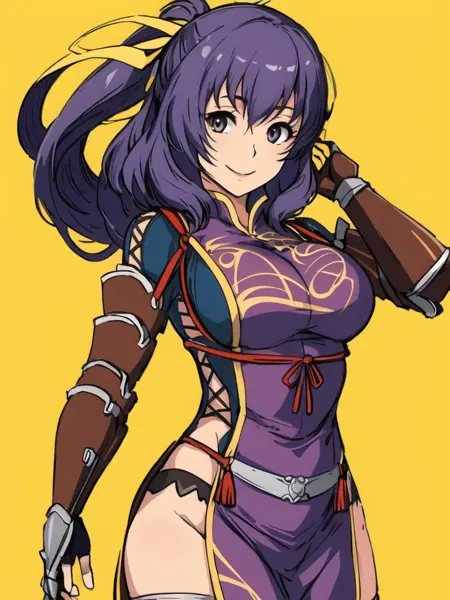 添加“披风”、“紫色连衣裙”、“护腕”和“发带”以呈现她典型的造型。