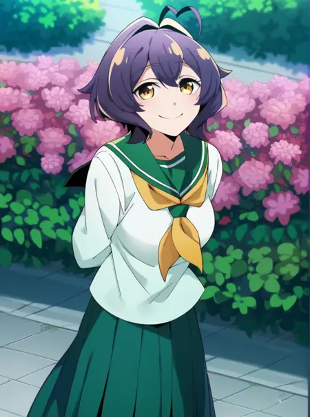 For school uniform use: utenaxl, short hair, purple hair, ahoge, yellow eyes, green serafuku, white shirt, long sleeves, pleated skirt, green skirt, long skirt, school uniform