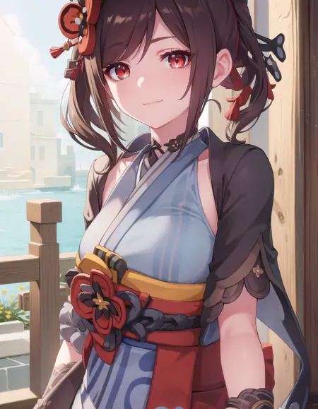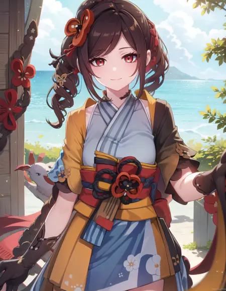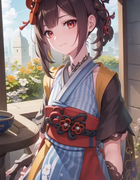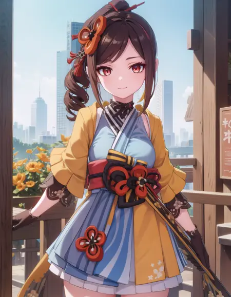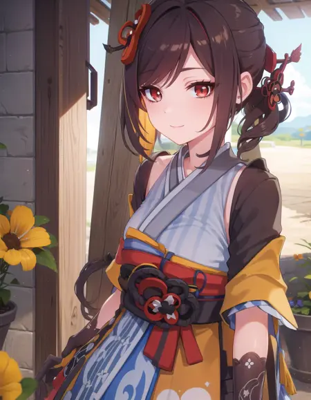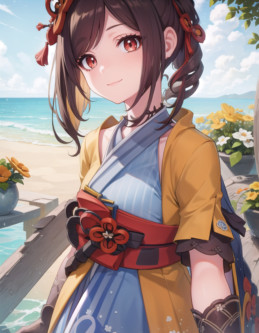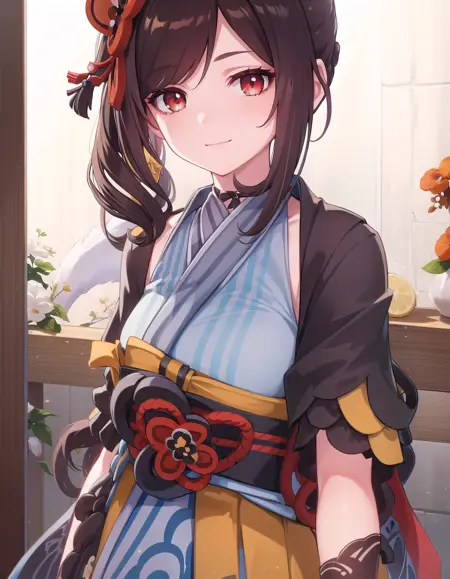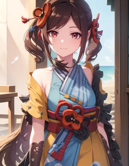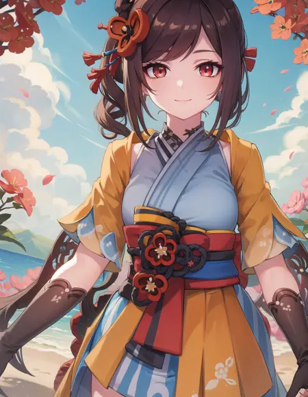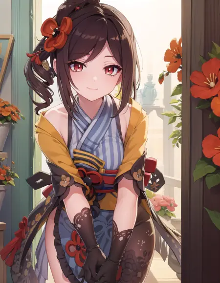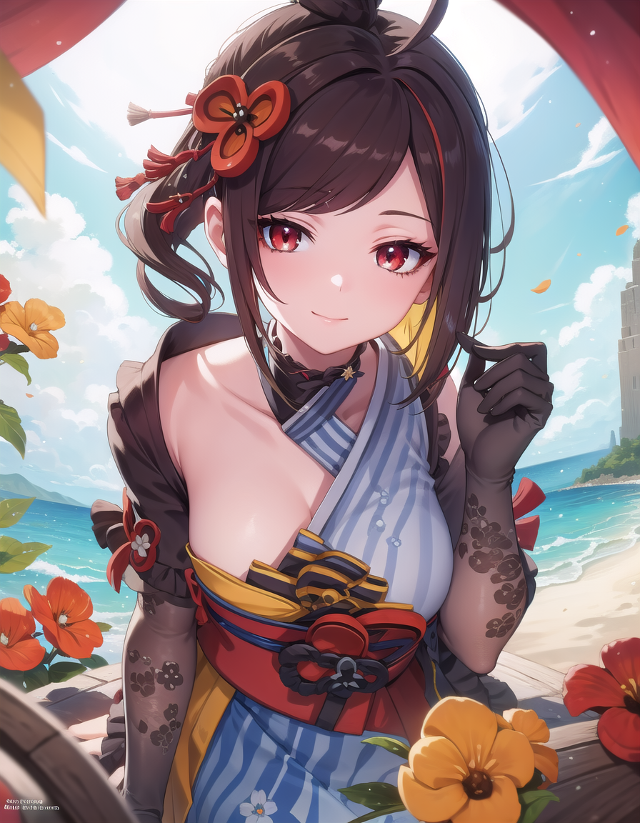 chiori, brown hair, hair ornament, (red eyes:1.3), flower, hair flower,