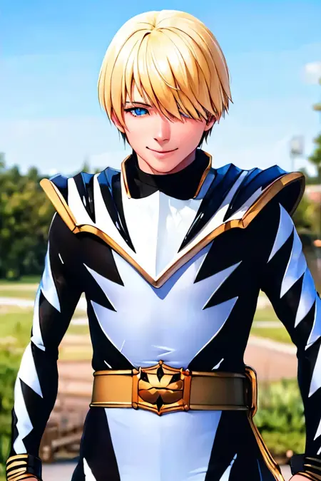 dtwhite, male focus, 1boy, belt, bodysuit, gloves, armor, (EX: blonde hair, blue eyes, hair over one eye)