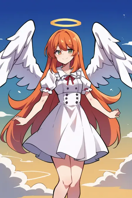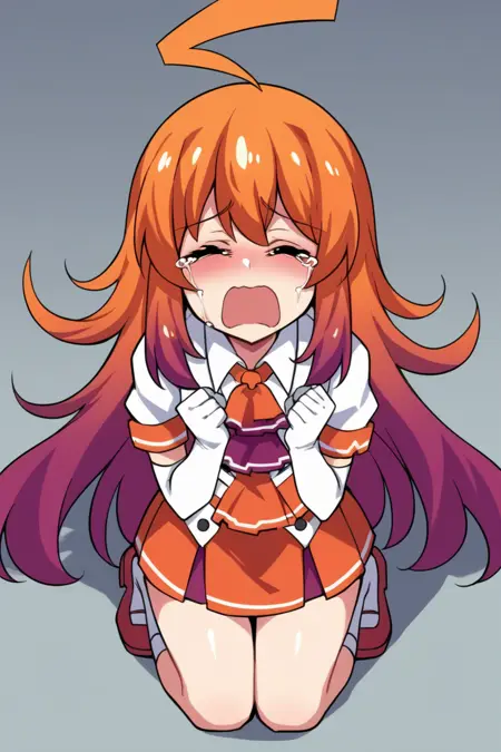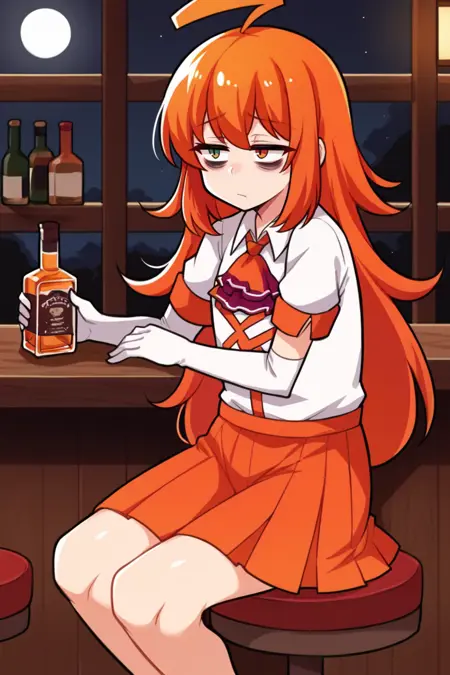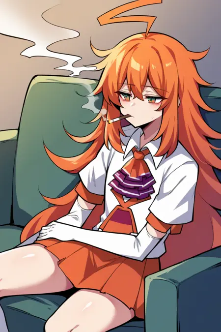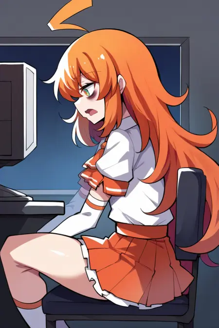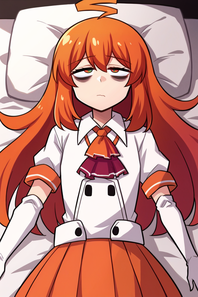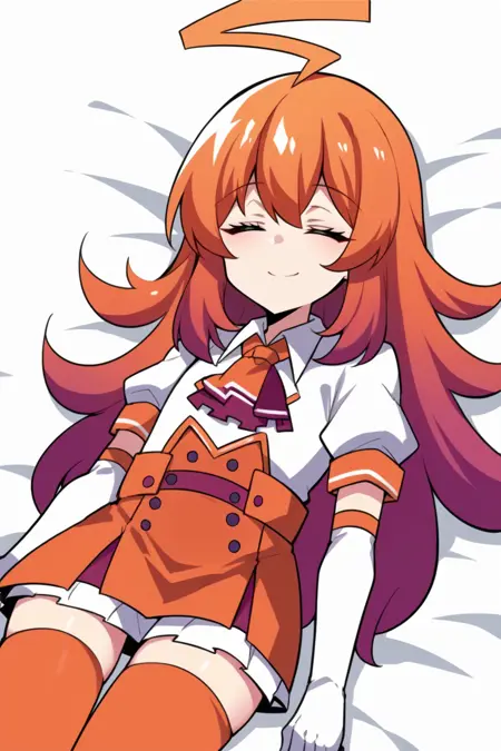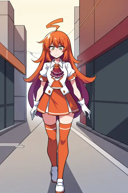 Add "orange and white shirt, orange ascot, short sleeves, white gloves, elbow gloves, orange skirt" for her typical look.