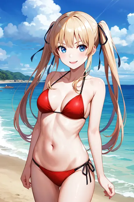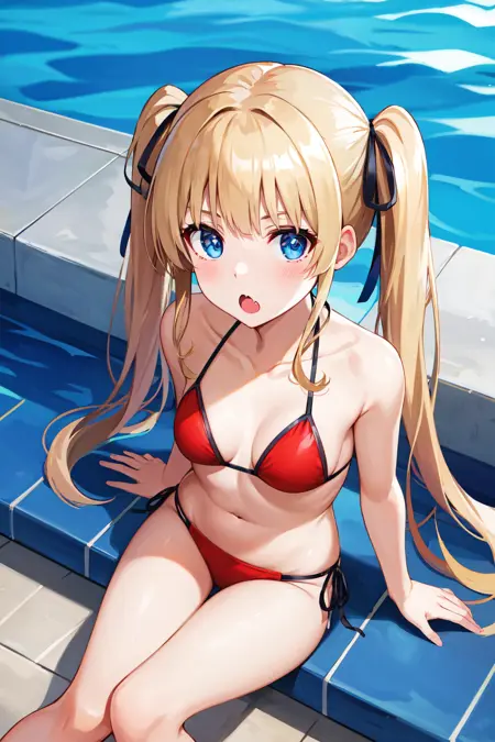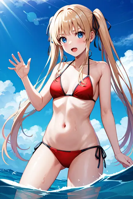아웃핏3aaeriri, 긴 머리, 트윈테일, 헤어 리본, 송곳니, 빨간 비키니, 스트링 비키니