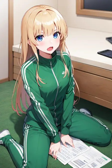 아웃핏2aaeriri, 긴 머리, 송곳니, 트랙 재킷, 녹색 재킷, 긴 소매, 트랙 바지, 녹색 바지