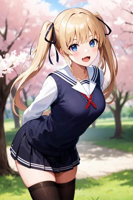 아웃핏1aaeriri, 긴 머리, 트윈테일, 헤어 리본, 송곳니, 학교 유니폼, 선원 칼라, 흰 셔츠, 스웨터 조끼, 긴 소매, 접힌 스커트, 검은 스커트, 검은 허벅지 양말