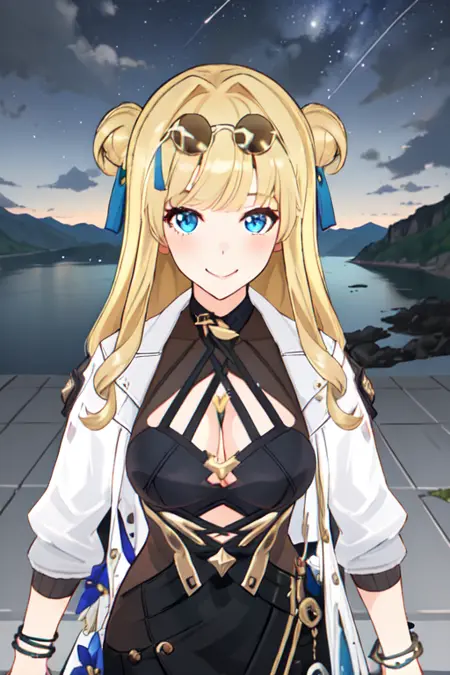 songque, black dress, white jacket, open clothes, black footwear, cleavage, open jacket, eyewear on head, ring, long sleeves, clothing cutout, bracelet, hair ribbon
