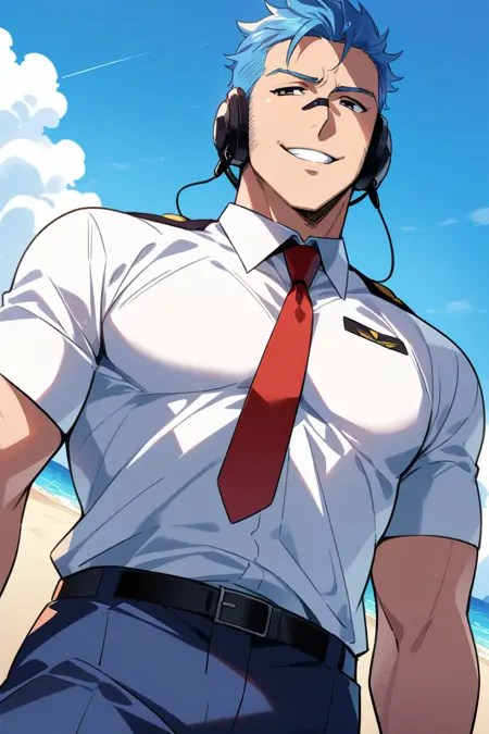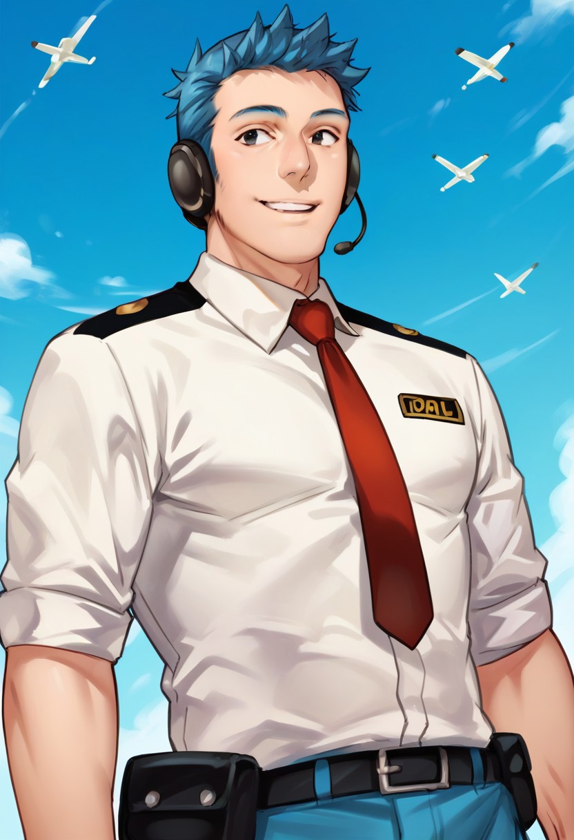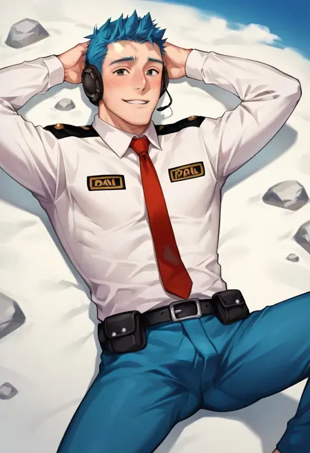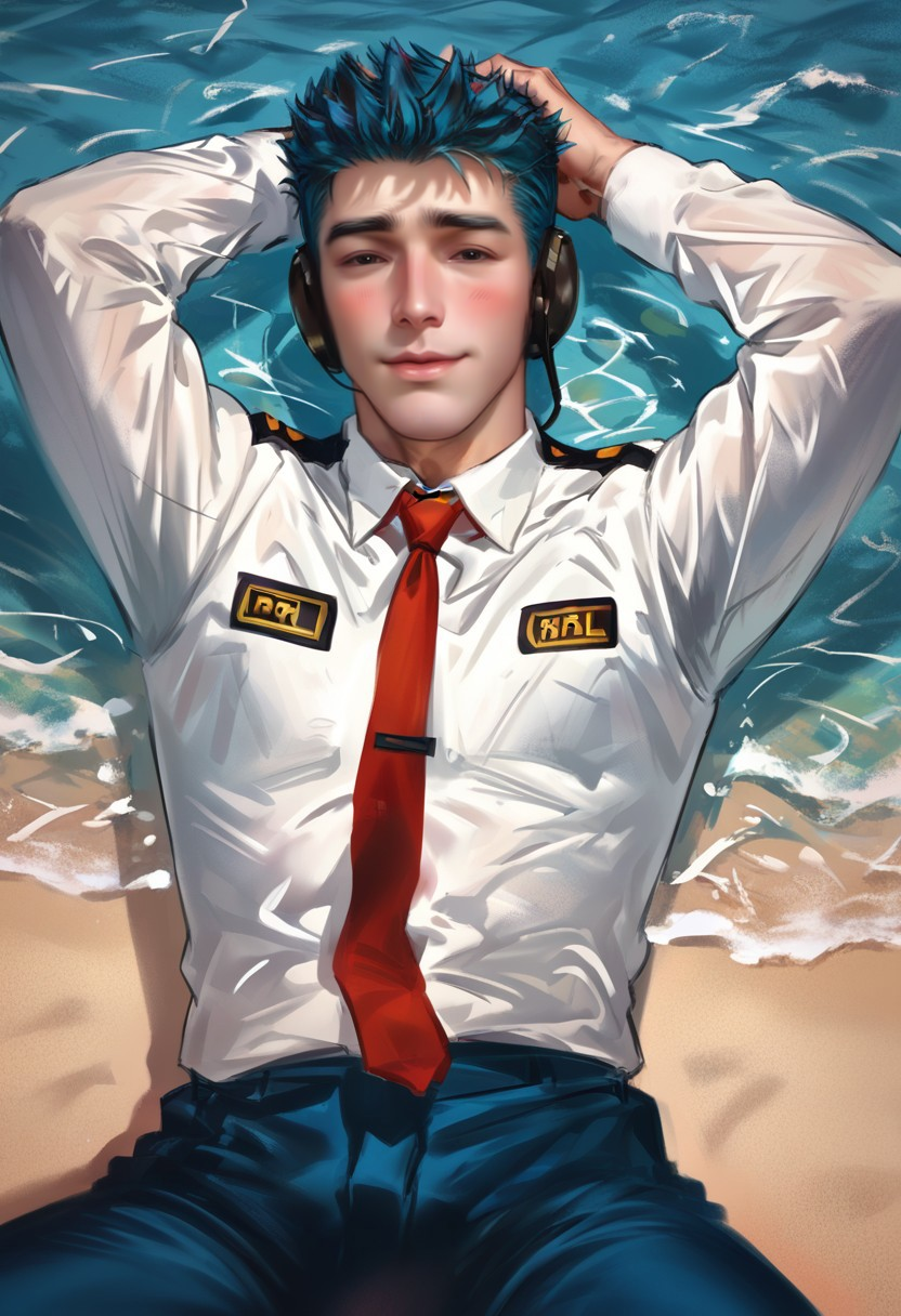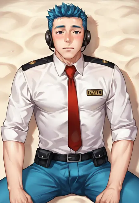 Prompt: blue hair, short hair, black eyes, aviation pilot uniform, white collor shirt, red necktie, epaulette, blue pants, socks, black footwear, (bandaid on nose)