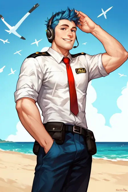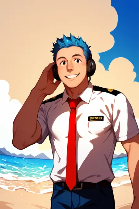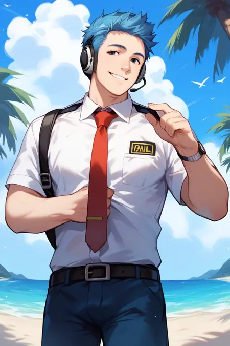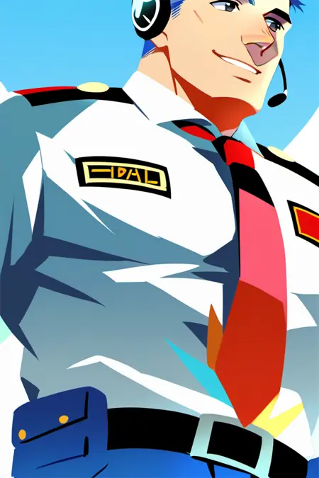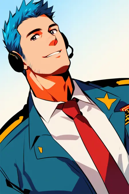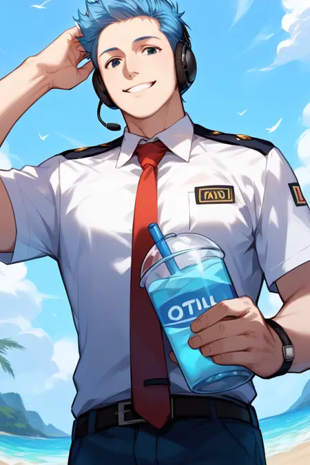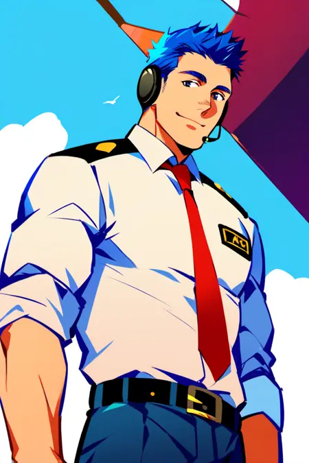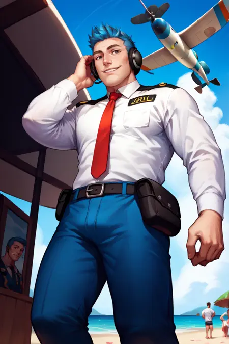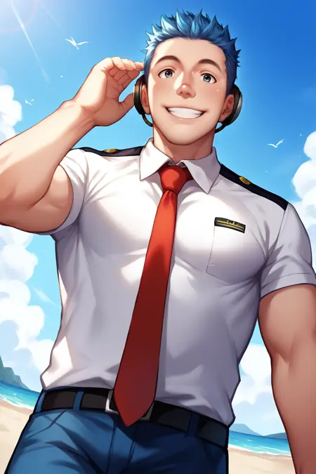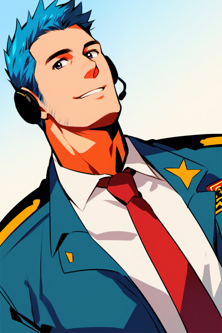 Prompt: blue hair, short hair, black eyes, aviation pilot uniform, white collor shirt, red necktie, epaulette, blue pants, socks, black footwear, (bandaid on nose)