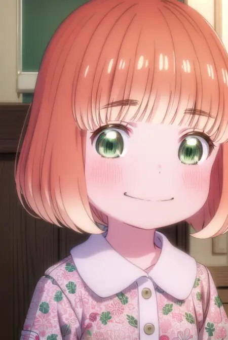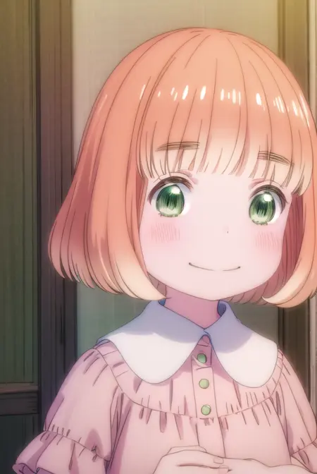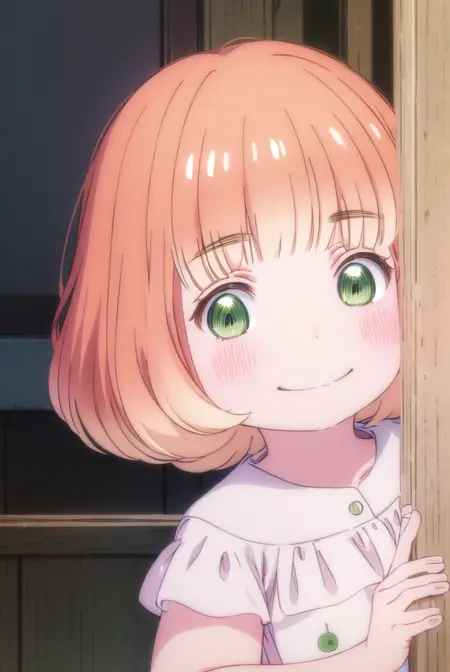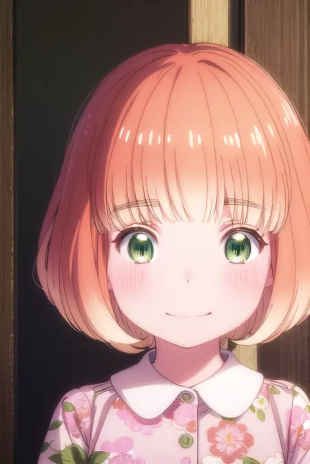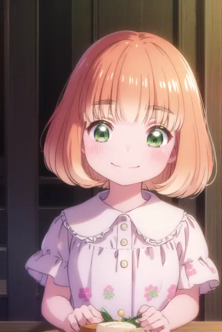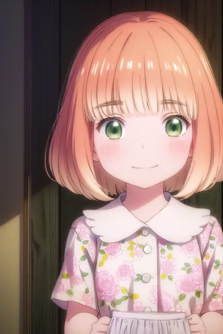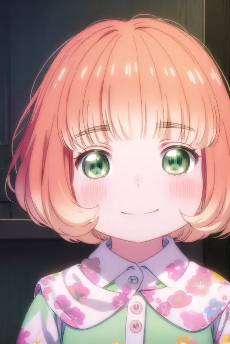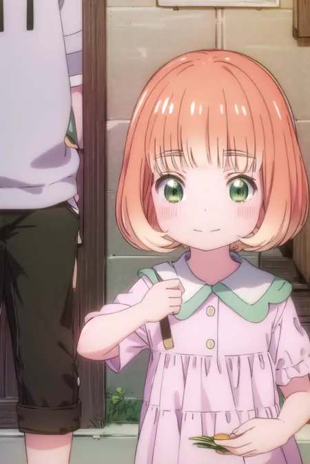 momo kawamoto, short hair, bangs, (green eyes:1.3), blunt bangs, orange hair, bob cut, child, female child,