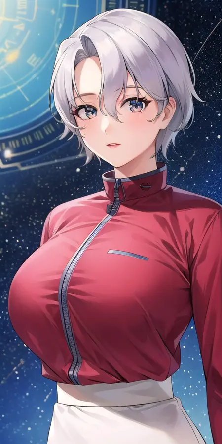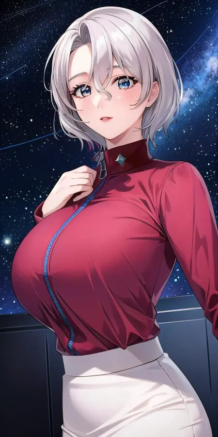 Red_shirt_Long_sleeves_Zipper_White_pencil_skirt_miniskirt: her uniform sans jacket.