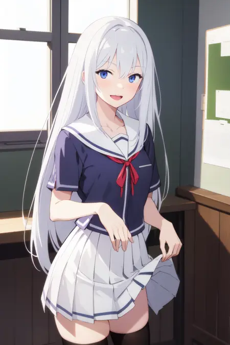빨간 리본, 목 리본, 학교 uniform, serafuku, 흰 치마, 흰 해적 칼라, (검은 허벅지 양말, 치마 들기:1.3), (sfw:1.1), 팬티 없음