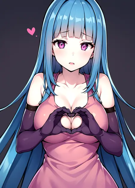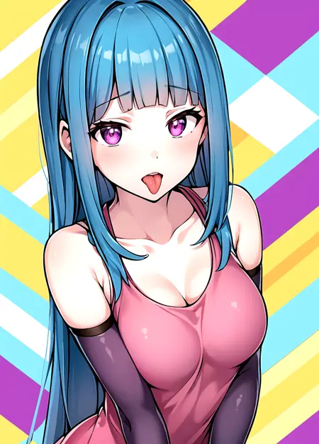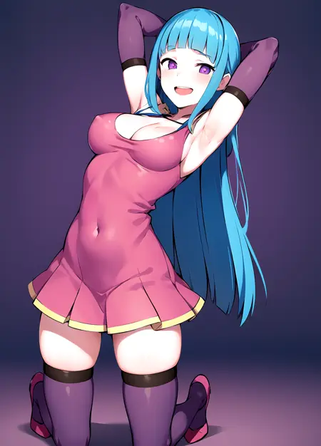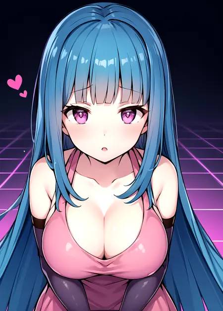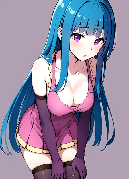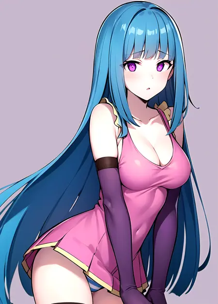 first outfit: MEMEME, long hair, dress, breasts, pink dress, purple eyes, very long hair, blue hair, medium breasts, collarbone, detached sleeves, cleavage, sleeveless, elbow gloves, sleeveless dress, gloves, purple thighhighs,