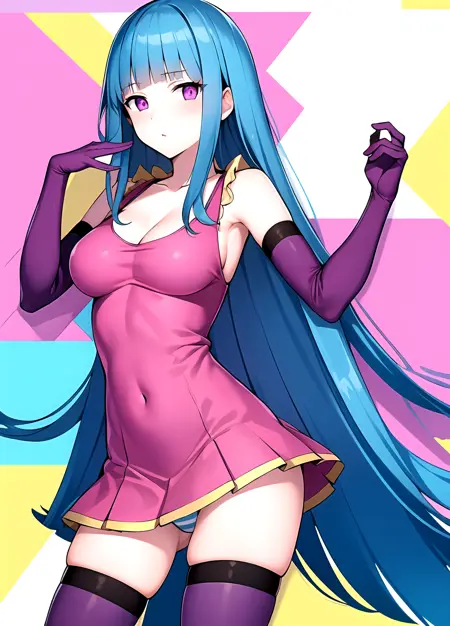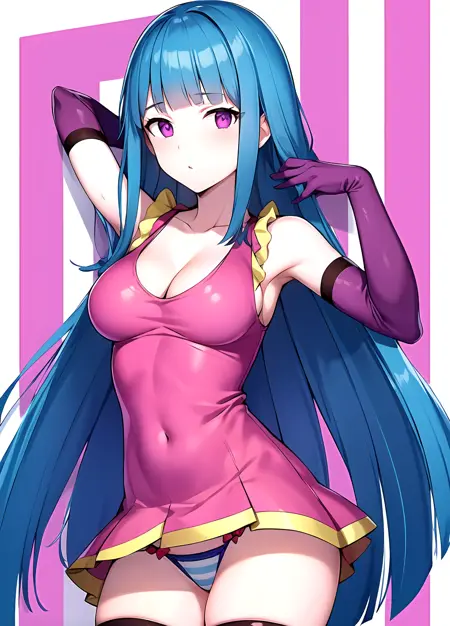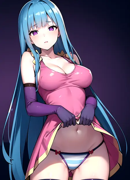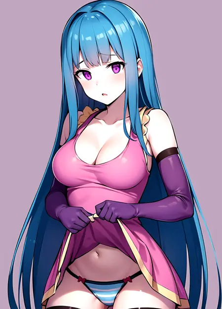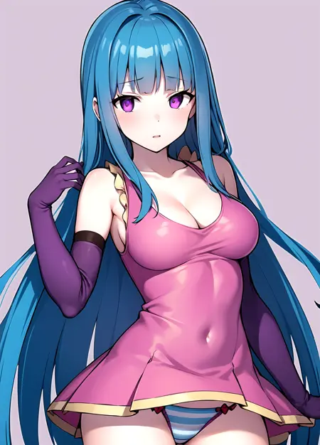 first outfit: MEMEME, long hair, dress, breasts, pink dress, purple eyes, very long hair, blue hair, medium breasts, collarbone, detached sleeves, cleavage, sleeveless, elbow gloves, sleeveless dress, gloves, purple thighhighs, blue panties, striped panties,