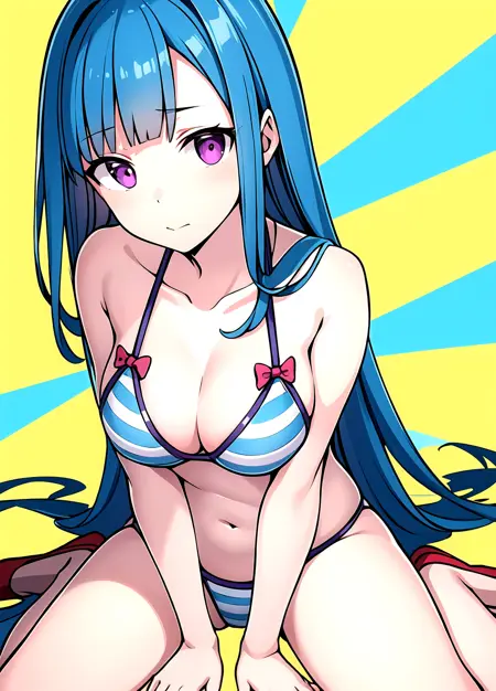 second outfit: MEMEME, 1girl, solo, swimsuit, bikini, long hair, purple eyes, striped bikini, breasts, striped, navel, very long hair, medium breasts, groin, blue hair