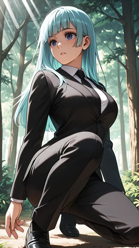 kasumi_miwa_jjk, long hair, aqua hair, blunt bangs, blue eyes, black suit, black tie, collared shirt,