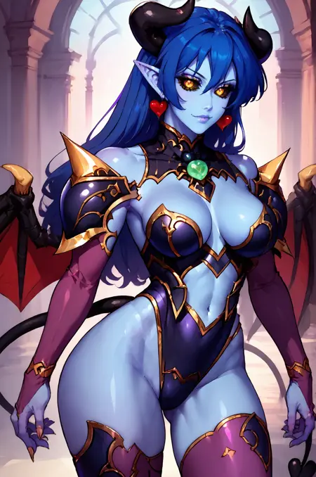Example Prompt with outfit: asuta, solo, long_hair, succu_armor, blue_skin, black_sclera, leotard, red_wings, earrings, bridal_gauntlets, tail, jewelry, thighhighs, navel, yellow_eyes, blue_hair