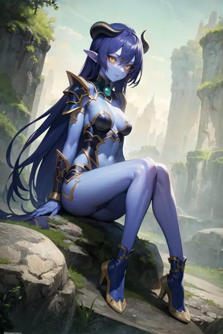 Example Prompt with outfit: asuta, solo, long_hair, succu_armor, blue_skin, black_sclera, leotard, red_wings, earrings, bridal_gauntlets, tail, jewelry, thighhighs, navel, yellow_eyes, blue_hair