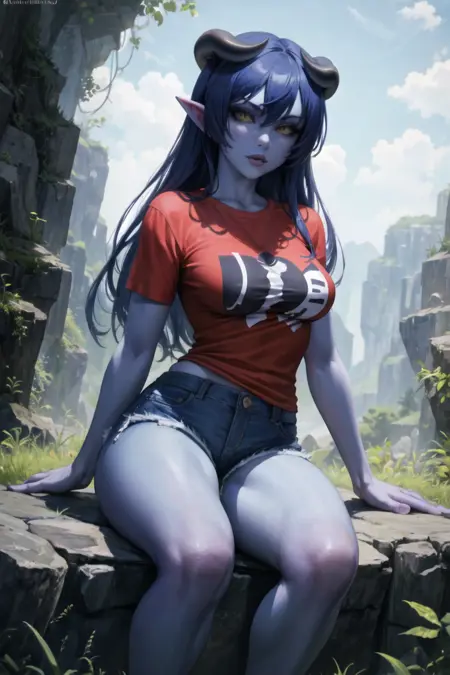 Example Character Prompt for Pony: asuta, solo, long_hair, blue_skin, black_sclera, red_wings, earrings, tail, navel, yellow_eyes, blue_hair