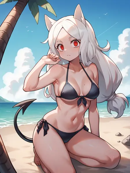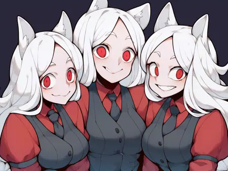 基本プロンプト:cerberus \(helltaker\), 3girls, white hair, long hair, red eyes, dog ears, demon tail