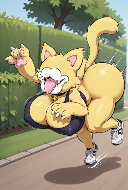 furry : dick sucking creature, piranha lips, piranha, eyeless, pale yellow body, fluffy, fur, cat attributes, cat ears, tail, cat paws, white lips, sharp teeths, large breast, large butt, collar, tongue out, pink nipples,
