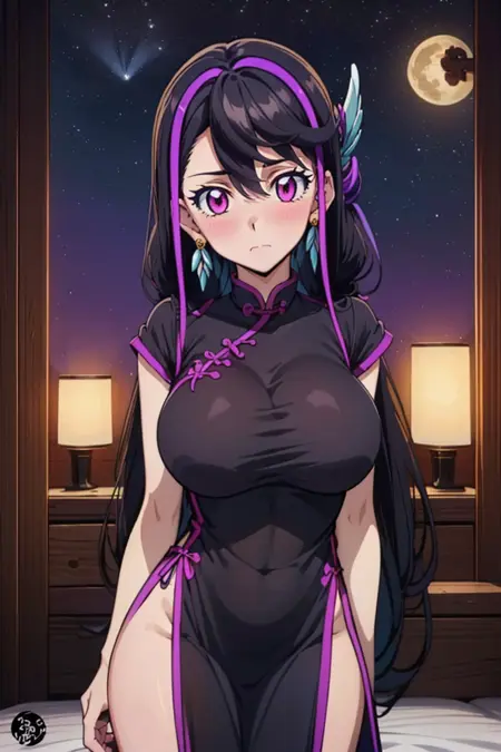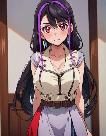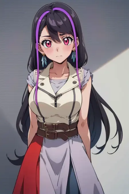 lulu obsidian, black hair with purple highlight, pink eye's, sleeveless vest, two leather belts, gray and red skirt, black pants