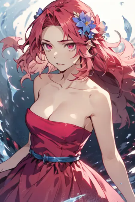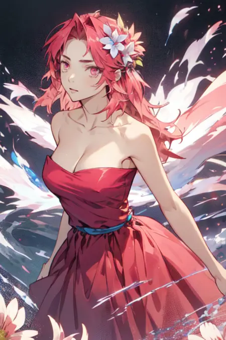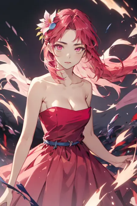 Dowon, 1girl, solo, long hair, hair ornament, strapless, red dress, cleavage, bare shoulders, medium breasts, collarbone, pink hair, hair flower, pink eyes, bare arms,