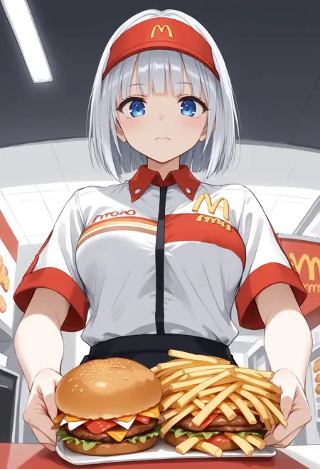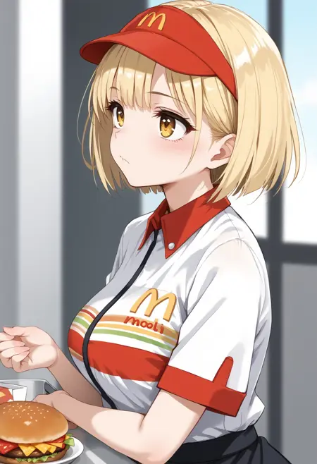 安定しない場合はemployee uniform, fast food uniform, visor cap, short sleeves, clothes writingを入れてみて下さい。