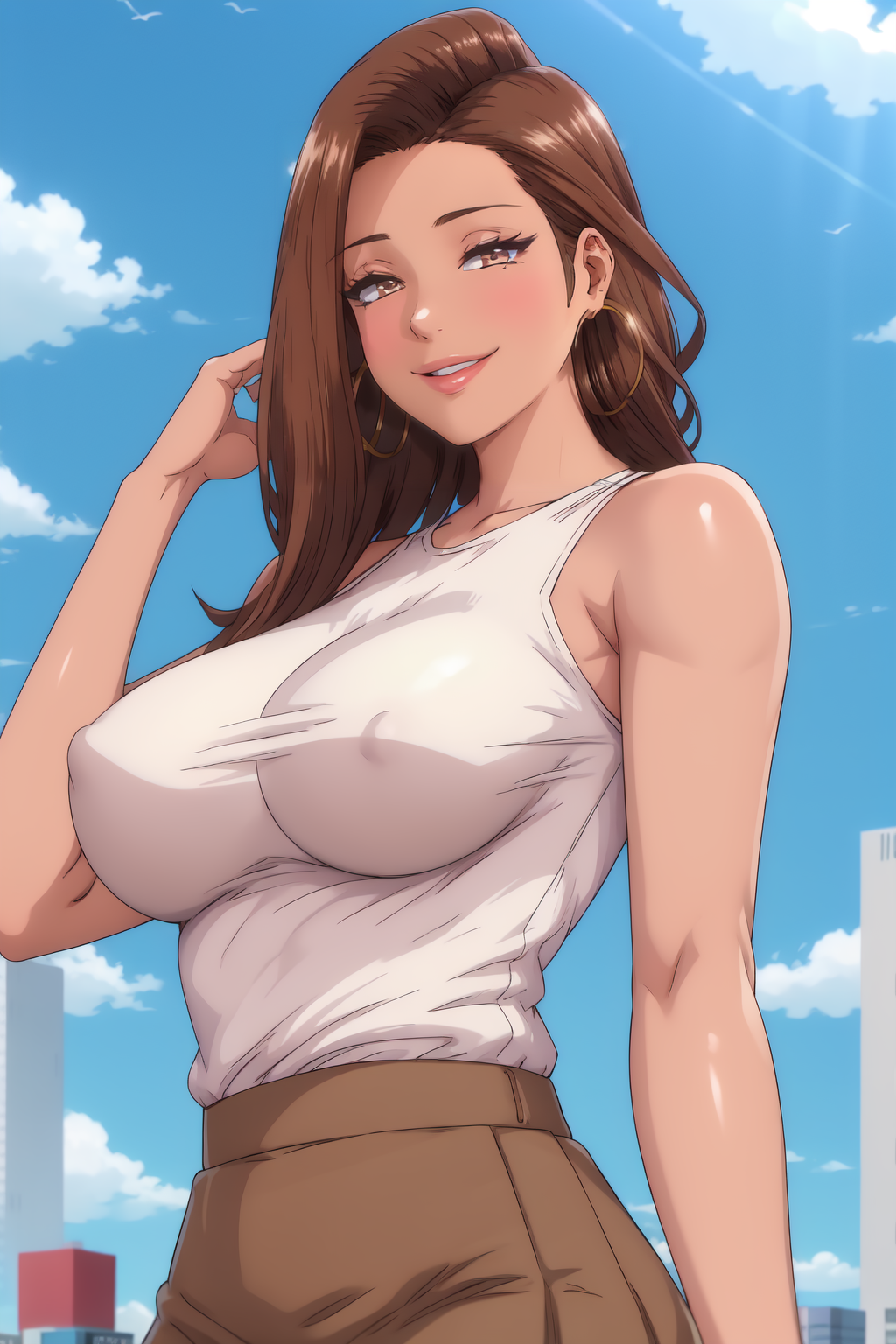 Recommended use range: 0.7 - 0.9. I grabbed a sample of her in every (good) shot she was in. Despite her limited screen time I think the LoRA still came out nicely! Her outfit is tank top, sleeveless shirt, brown skirt. Happy generating!