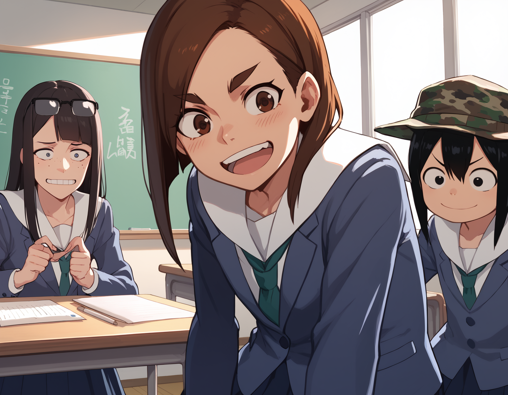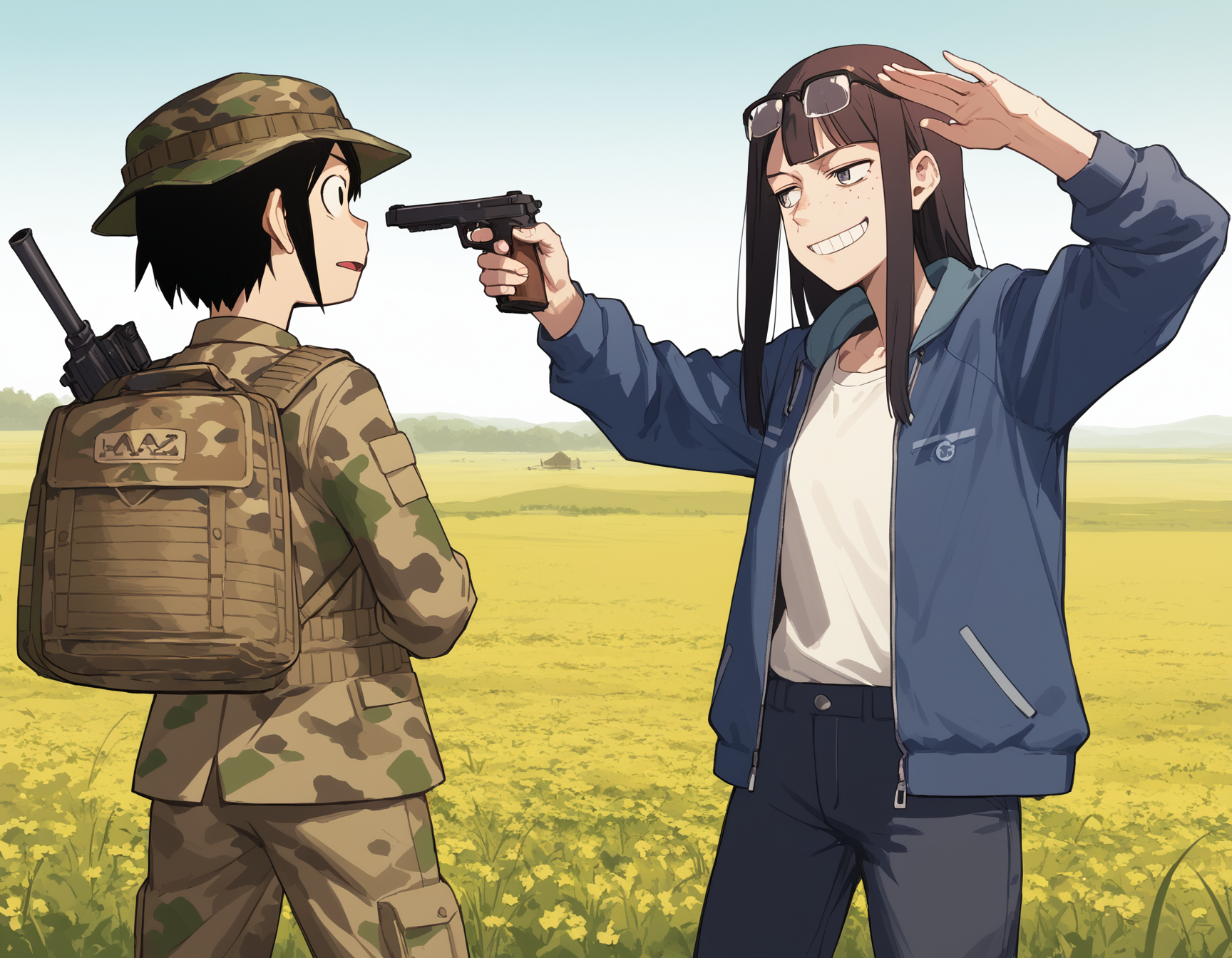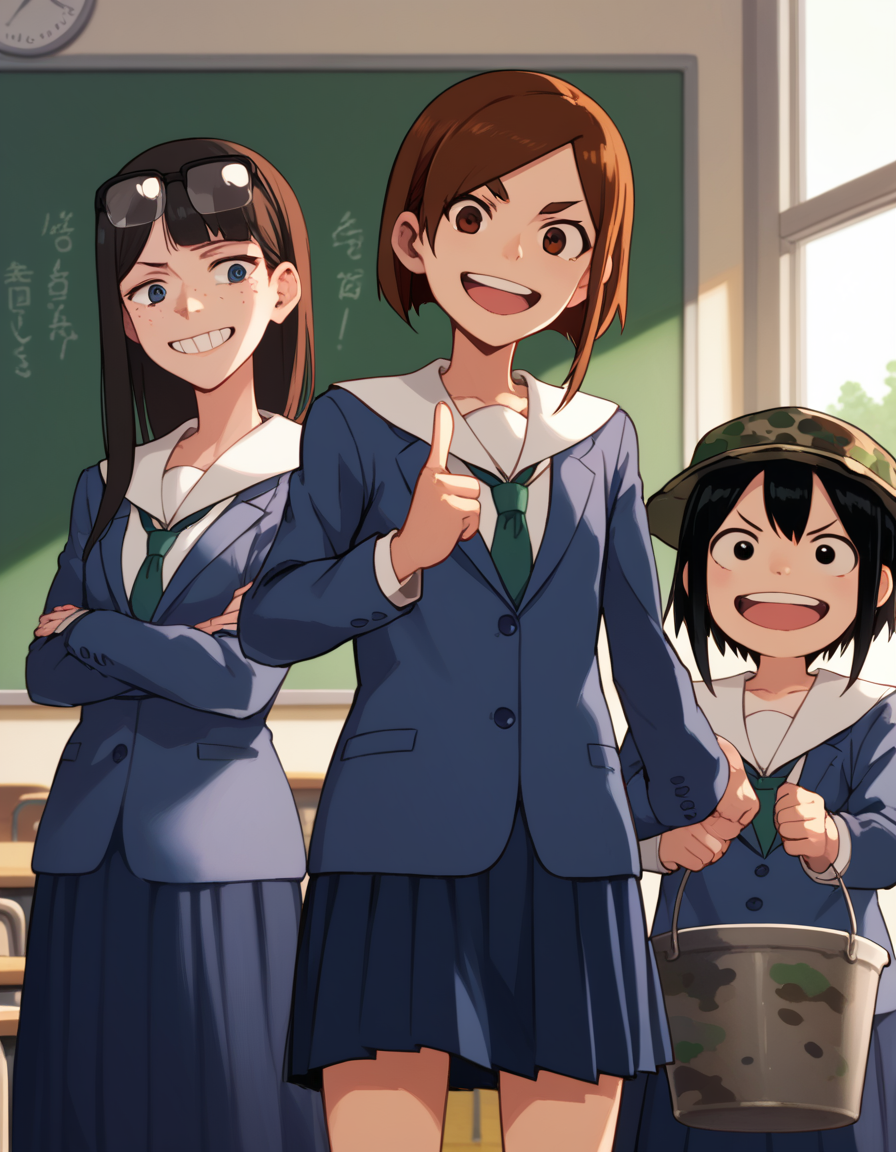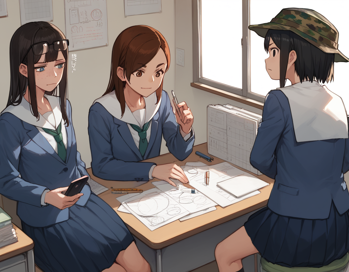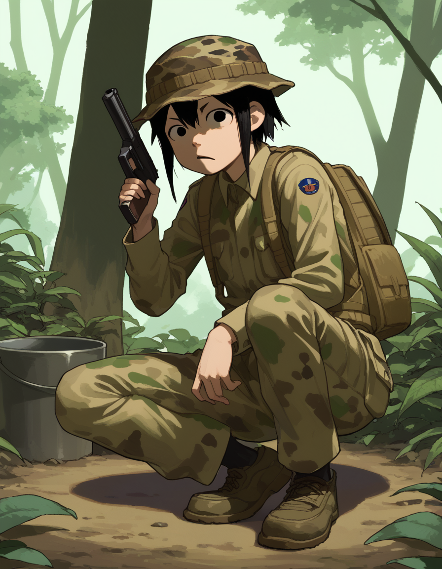 outfit: serafuku, pleated skirt, bucket hat, camouflage headwear