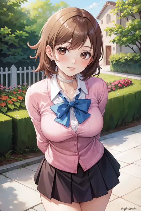 takeba_yukari, 短发, 项圈, 校服, 裙子, 饰品, 耳环, 蝴蝶结, 开襟衫, 衬衫, 中等大小胸部, 月光馆高中校服, 丝带, 超短裙, 大腿