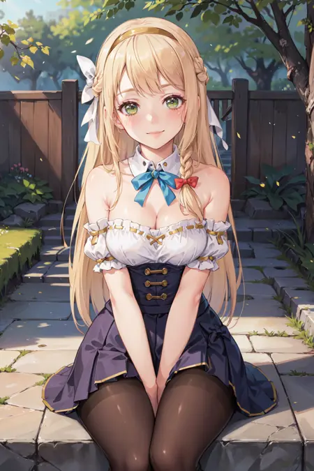 klaudia_valentz, long hair, braid, hairband, bare shoulders, pantyhose, skirt, bow, black pantyhose, medium breasts, cleavage, ribbon, hair bow