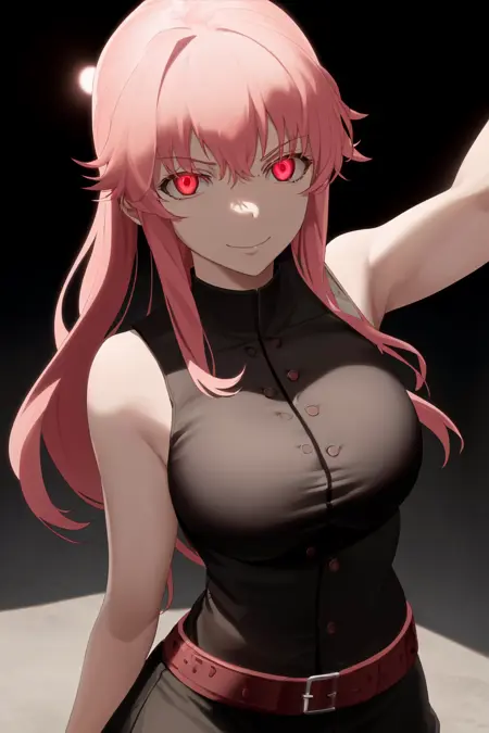 Yuno Gasai, 1girl, solo, ピンクの髪, 長い髪, 学校制服, 笑顔, ほほえみ, ピンクの目, スカート, ツインテール, リボン