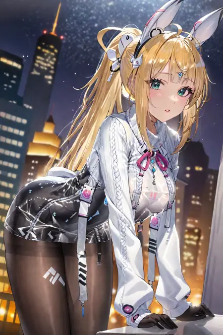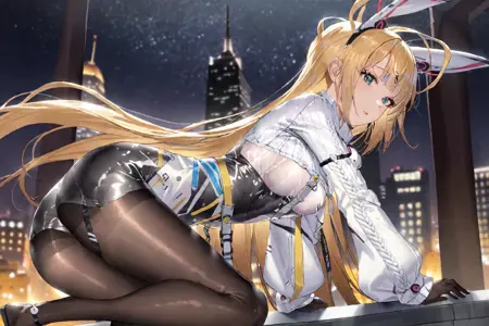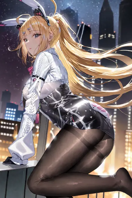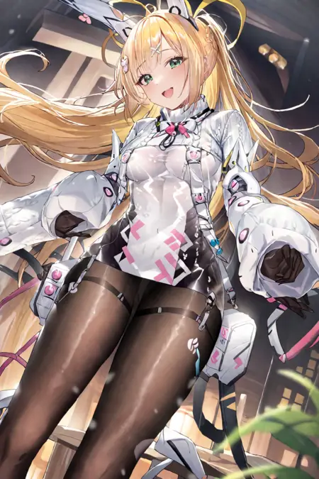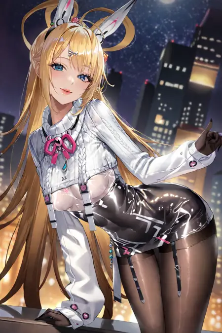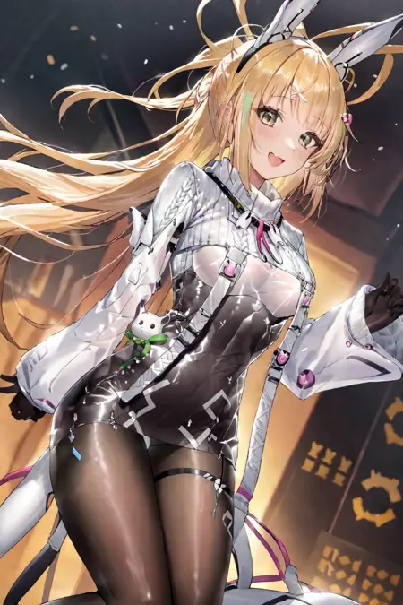 触发词:black pantyhose/black legwea, blonde hair, bangs, hair ornaments, sweater, animal ears, bodysuit, see through, 可自行选用