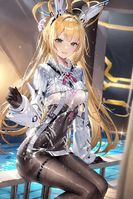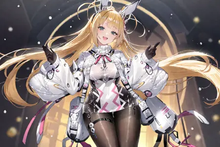 trigger words: black pantyhose/black legwear, blonde hair, bangs, hair ornaments, sweater, animal ears, bodysuit, see through