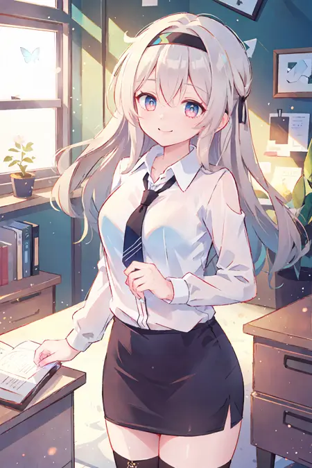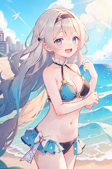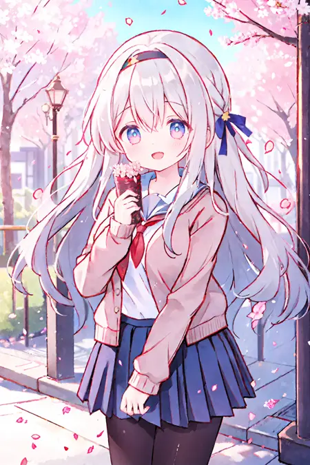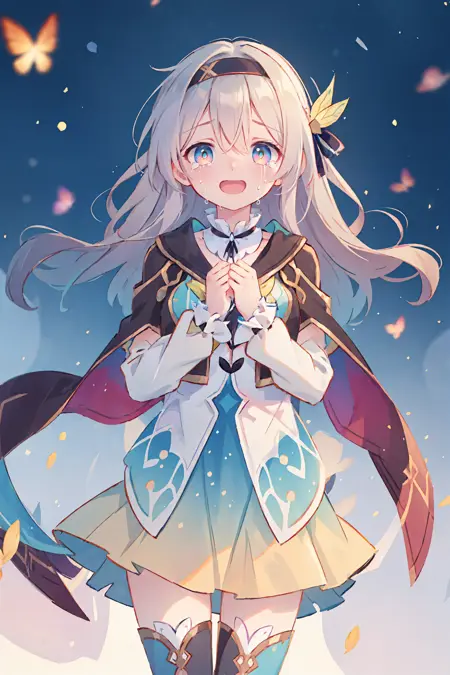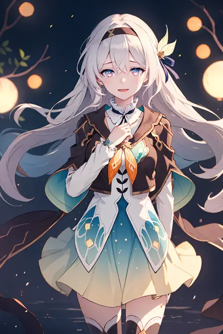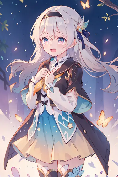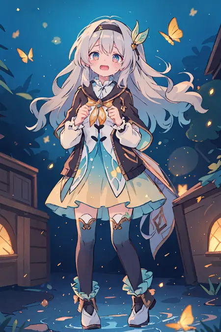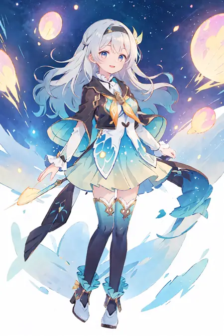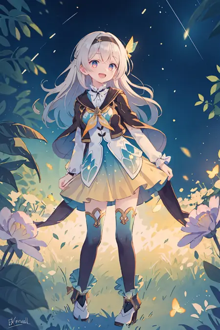 Additional prompts for default costume (V1.0V4.0): black thighhighs, hairband, frilled collar, gradient skirt, hair ornament, blouse, frilled boots, cropped jacket, yellow neckerchief~