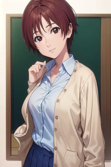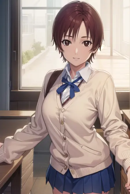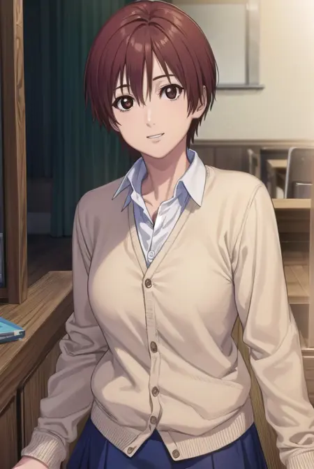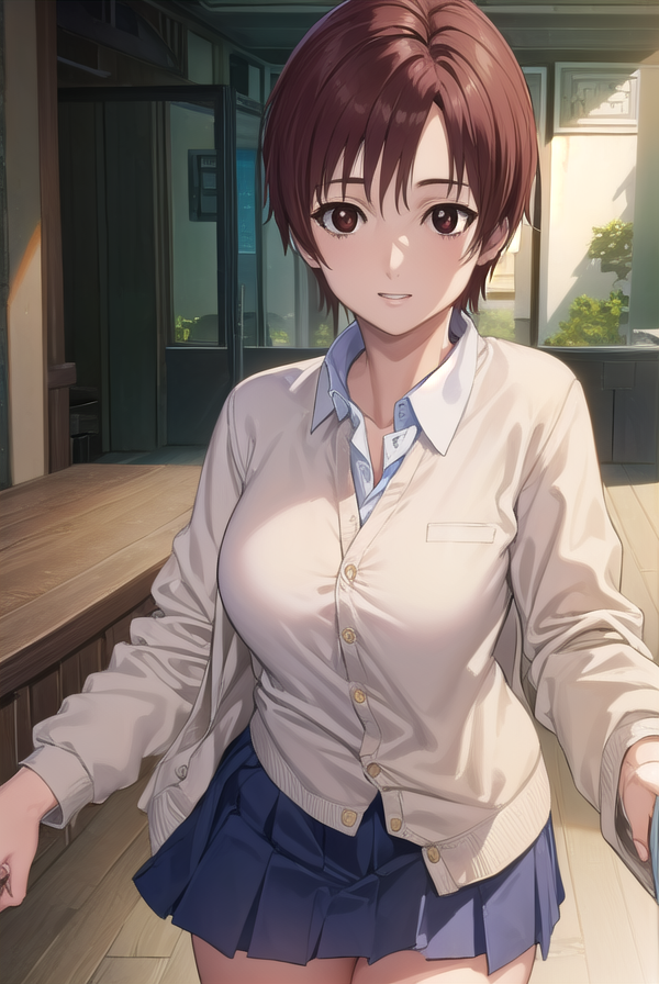 skirt, school uniform, cardigan, blue skirt, shirt, white shirt, collared shirt,