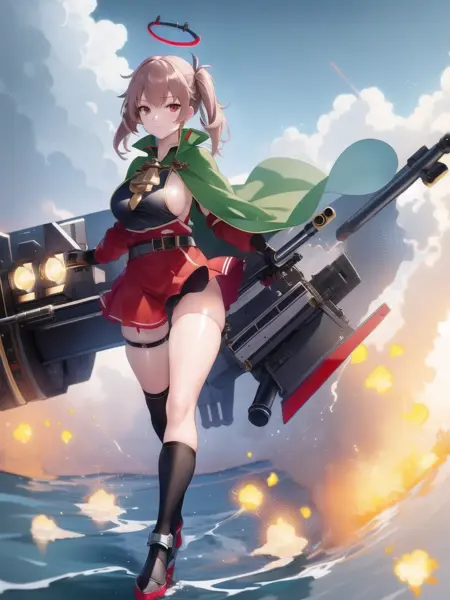2)装备工装 >>> Duca,身穿ITL_uniform的女性,头上带着红色光晕,棕色头发,侧面胸部,绿色斗篷,背上背着装备机械,机械上装有炮塔,鱼雷在空中飞行