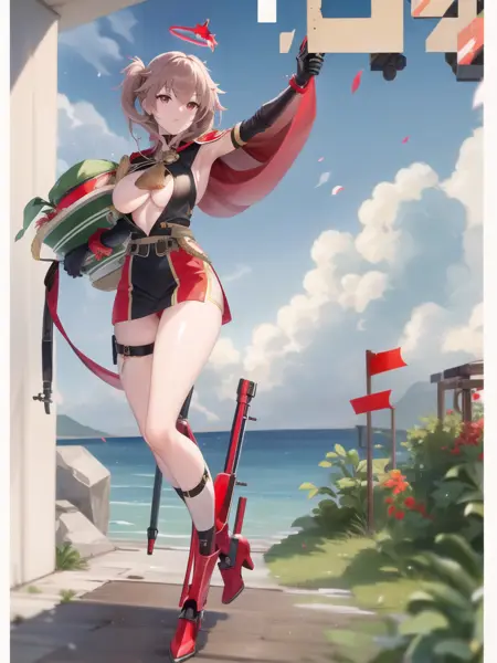 1) Default >>> Duca, a woman in a ITL_uniform, red halo on head, brown hair, sideboob, green cape