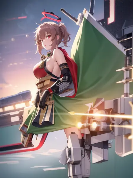 2) Rigging >>> Duca, a woman in a ITL_uniform, red halo on head, brown hair, sideboob, green cape, carrying riggging_machine on the back, turrets_equipped on rigging_machine, torpedoes flying