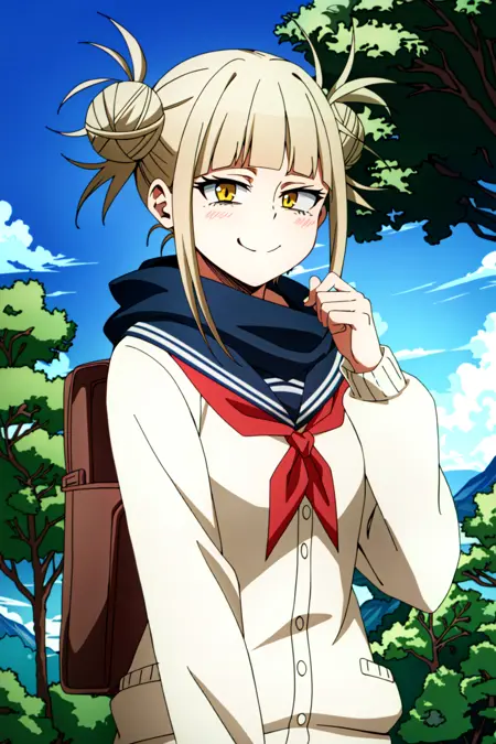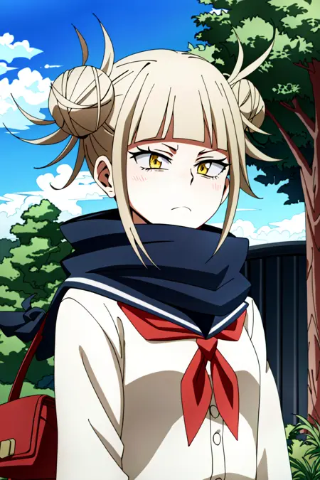 Himiko Toga, 1girl, toga himiko, 双发髻, 单人, 发髻, 刘海, 黄色眼睛, 天空, 白天, 金发, 凌乱的头发, 脸红, 齐刘海, 户外, 蓝天, 围巾, 红色围巾, 校服, 嘴闭着, 围巾, 侧发, 眼下有眼袋, 水手领, 牙齿, 服装配饰, 树, 皱眉, 短发, 卡迪根