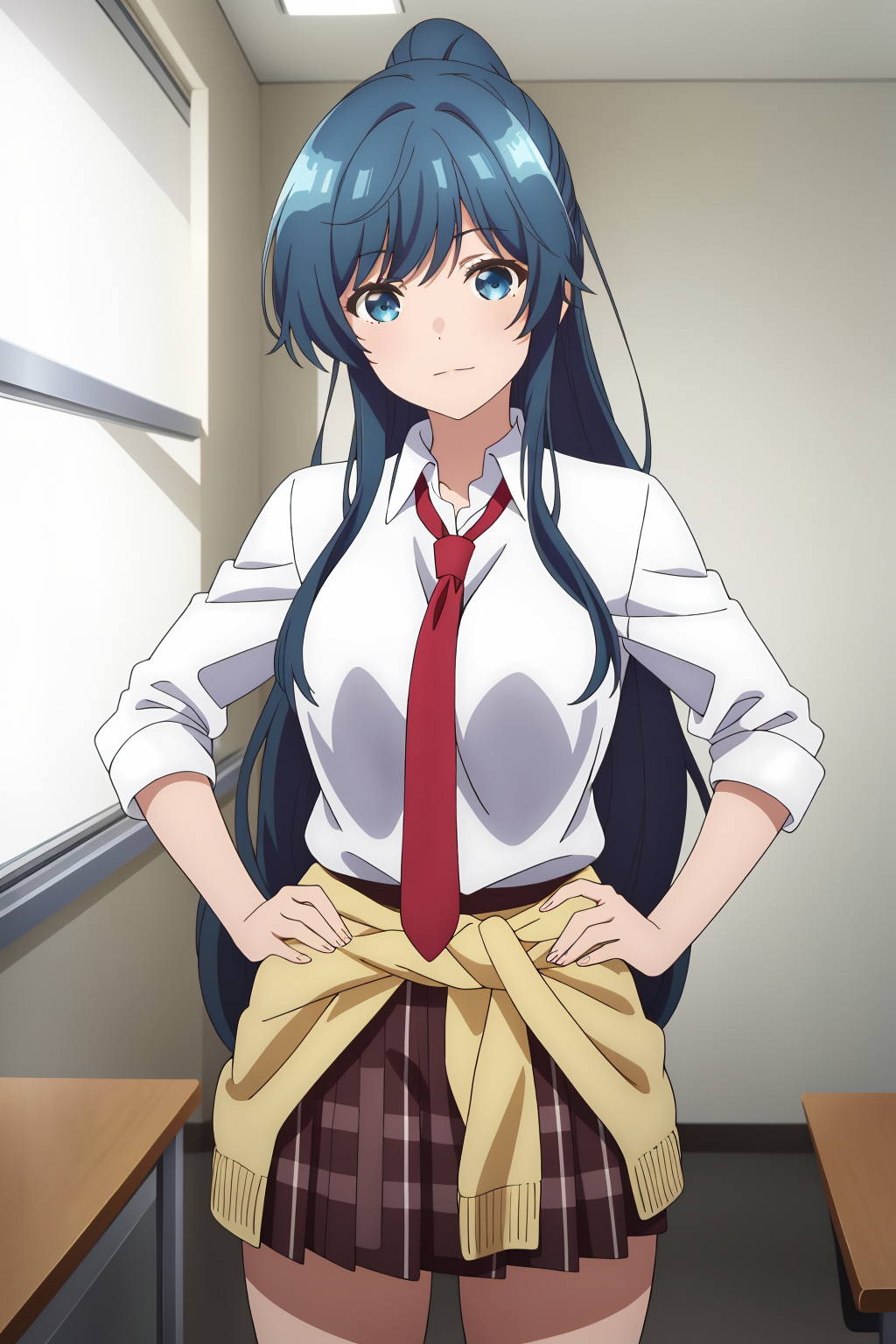 school uniform, plaid, plaid skirt, white shirt, pleated skirt, sleeves rolled up, red necktie, brown skirt, jacket around waist, sweater around waist