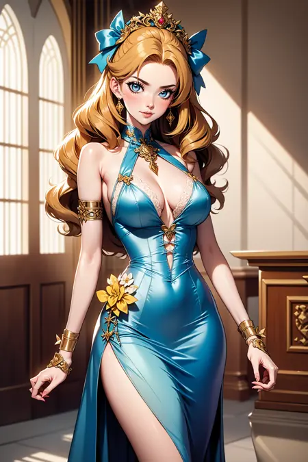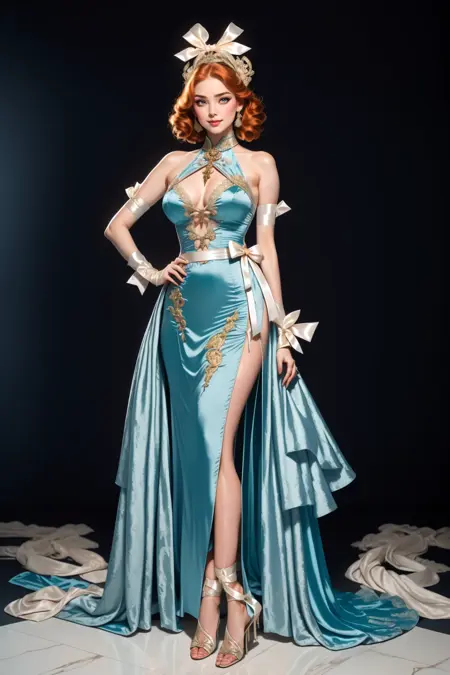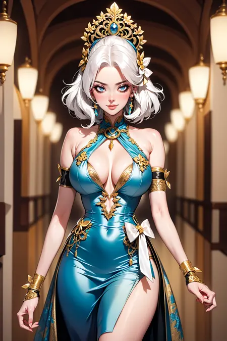 dr3ss, cross-laced clothes, (silk blue dress), (embroidered ornate) halterneck, high collar, jewelry, armlet, headdress, frills, cuffs, bows, ribbons, hair bow, cowboy shot