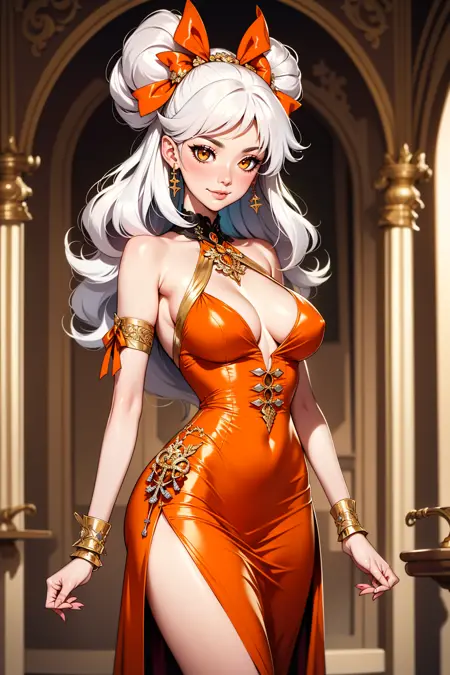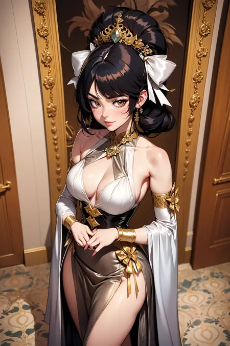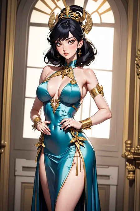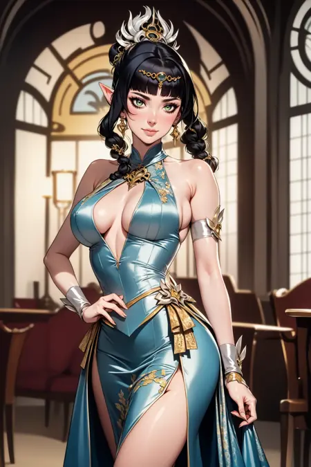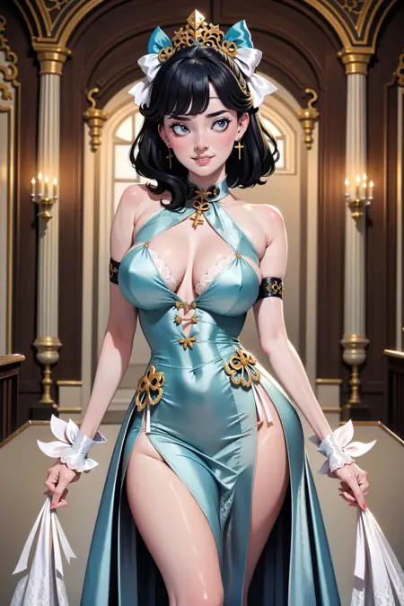 It has the aesthetic of a Cheongsam in silhouette, form and function with a sometimes-shy headress, with the bows, frills, laces and corset action and goofy hair of rococo fashion
