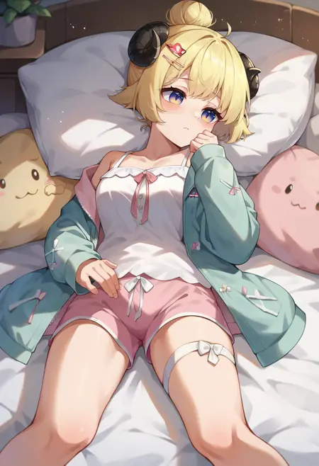 WatameSleep, hair bun, hairclip, blue jacket, hooded jacket, white camisole, pink shorts, thigh strap