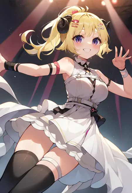 WatameNightFever, ponytail, hairclip, white dress, sleeveless, arm band, thigh strap, black thighhighs
