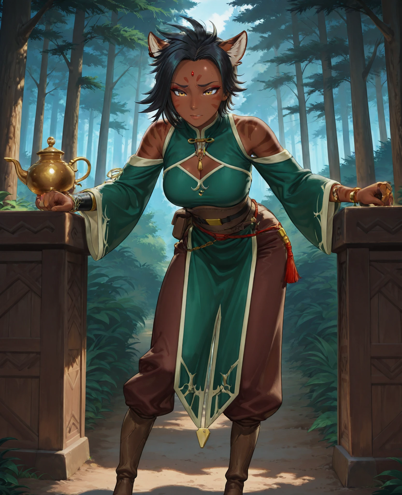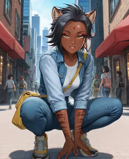 Appearance: short hair, black hair, animal ears, yellow eyes, cat ears, dark skin, dark-skinned female