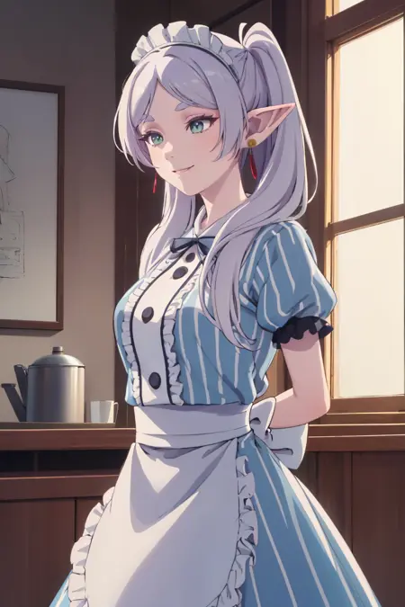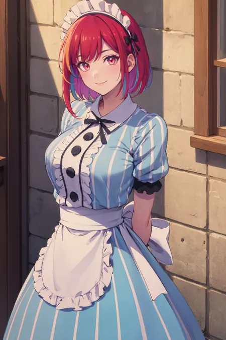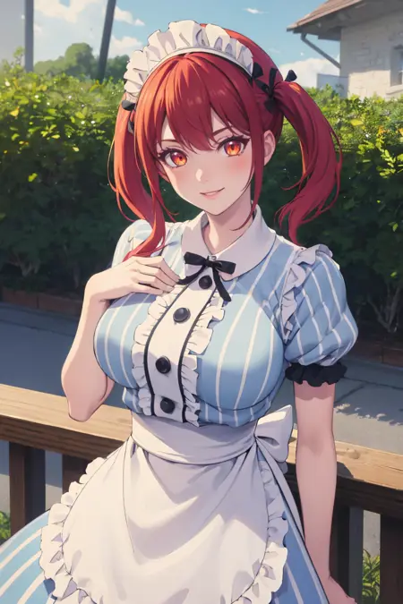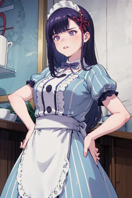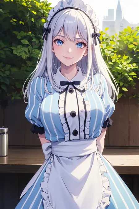 CafeTerraceUniform, maid headdress, striped dress, white apron, black ribbon