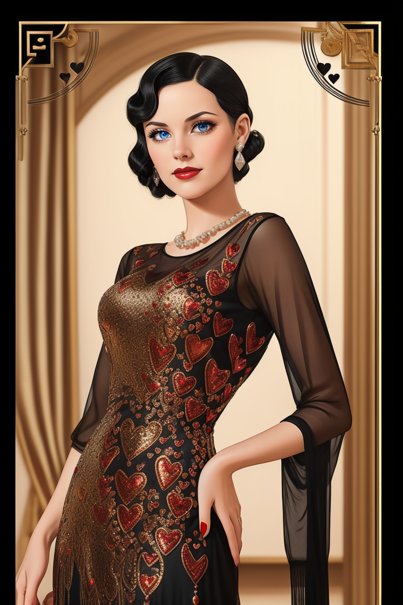 heart_20s, round neck heart beaded long flapper 1920s black dress, fringe