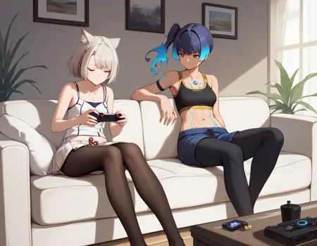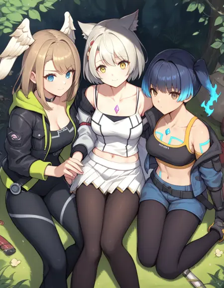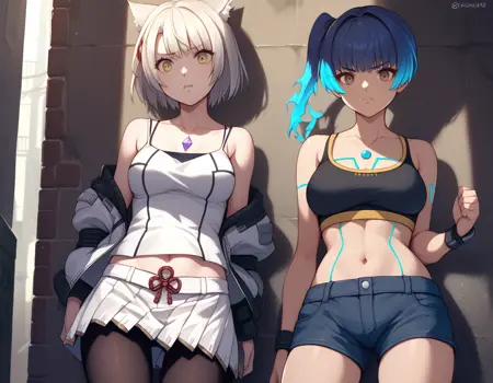 outfit:black pantyhose, chest jewel, midriff, navel, skirt, white camisole, white skirt