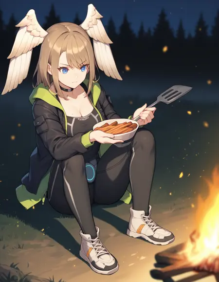 outfit:arm guards, armor, black footwear, bodysuit, cleavage cutout, clothing cutout, coat, grey coat, long sleeves, shoulder armor, thigh boots
